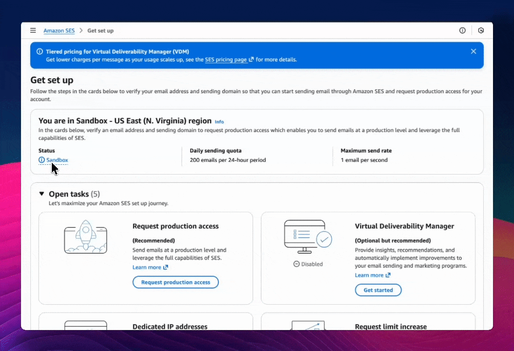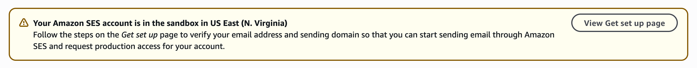 When you first set up AWS SES, your account is placed in sandbox mode. This is a safety measure to prevent abuse. You'll see this warning banner in your SES console: